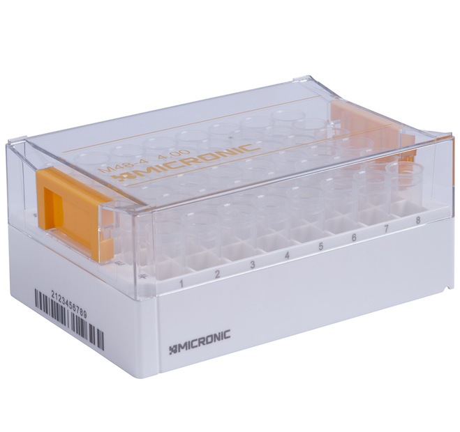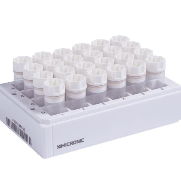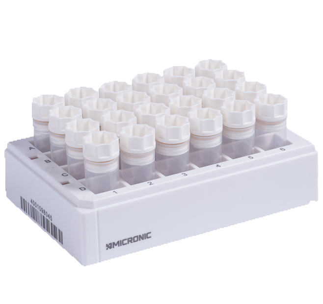 The Micronic ULT racks in 24-well format can hold 24 individual sample storage tubes in the following sizes: 1.50ml, 3.00ml, 3.50 ml, and 6.00 ml.