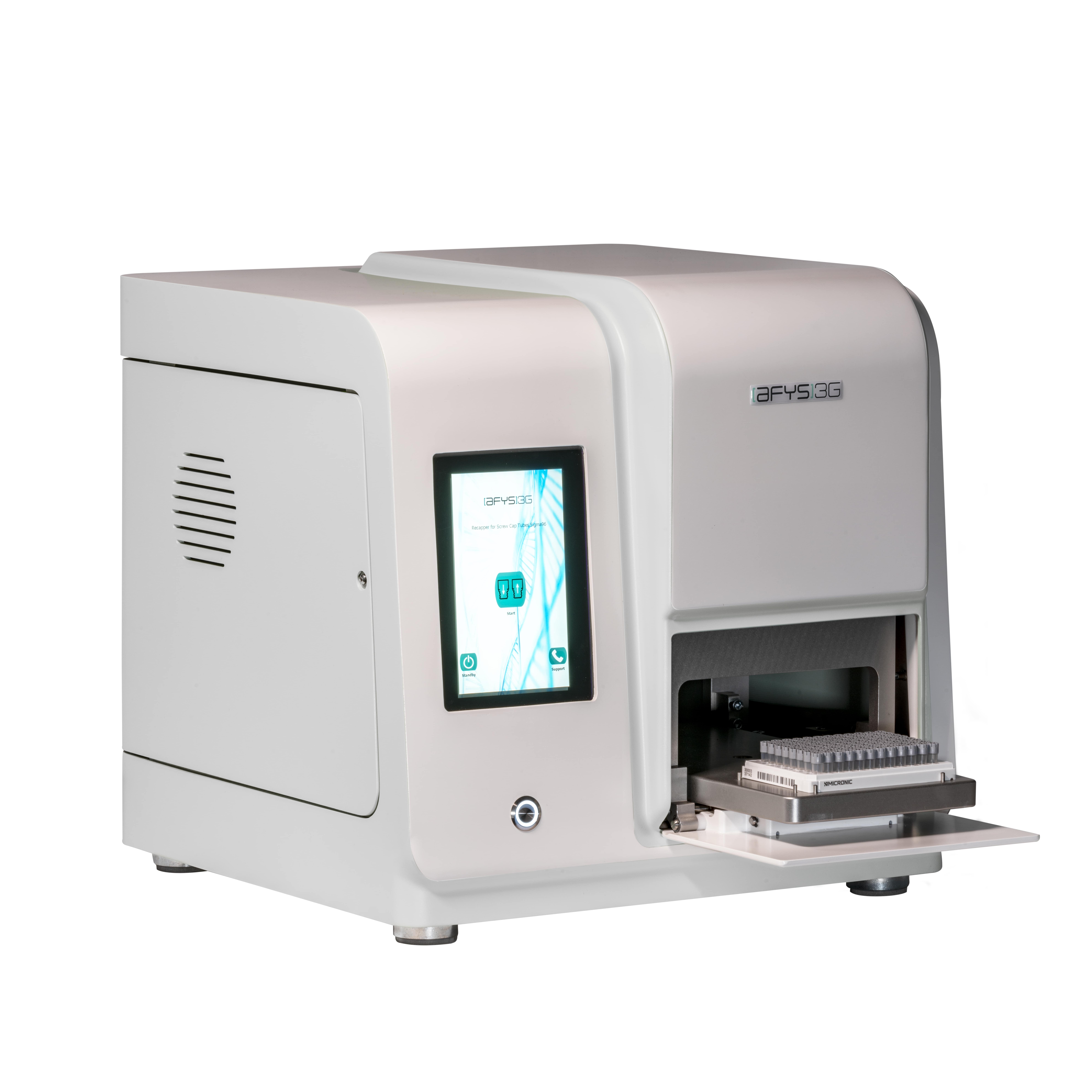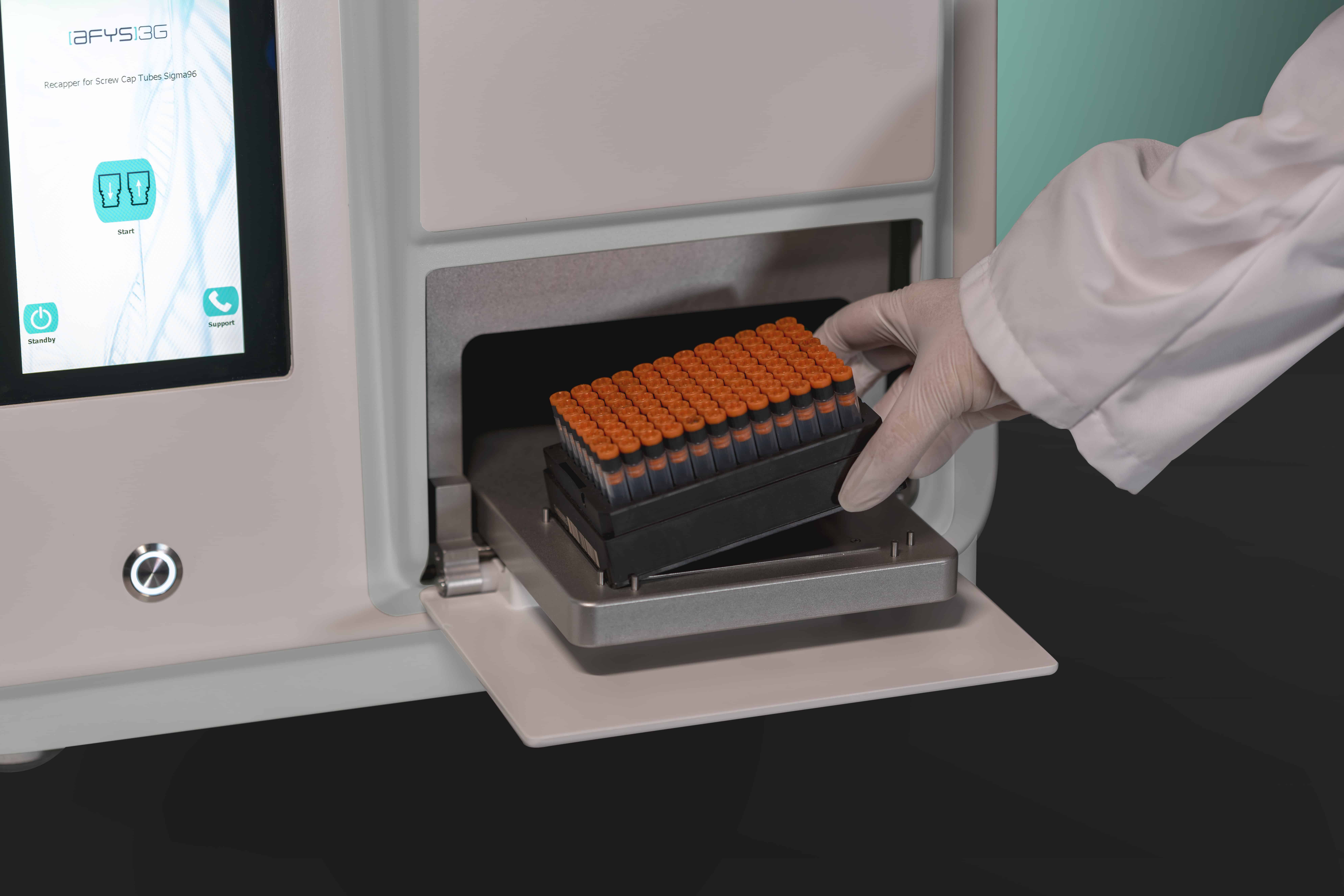With the focus on accelerating your workflow, NBS Scientific offers a robust recapping solution the Recapper for Screw Cap Tubes Sigma by AFYS3G. Because the Sigma is designed with efficiency in mind, it can be operated as a stand-alone instrument or integrated into a fully automated laboratory environment. By replacing manual labour with automation, researchers can focus on what matters most: Doing effective research. The Sigma is ideal for high throughput workflows because in less than 30 seconds it can (de)cap a whole rack of sample storage tubes. The Sigma by AFYS3G has three different editions: The Sigma96 for 96-well racks, Sigma48 for 48-well racks and the Sigma24 for 24-well racks.