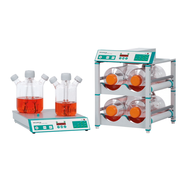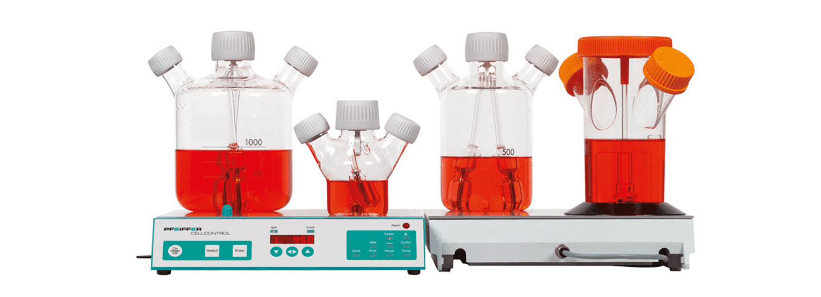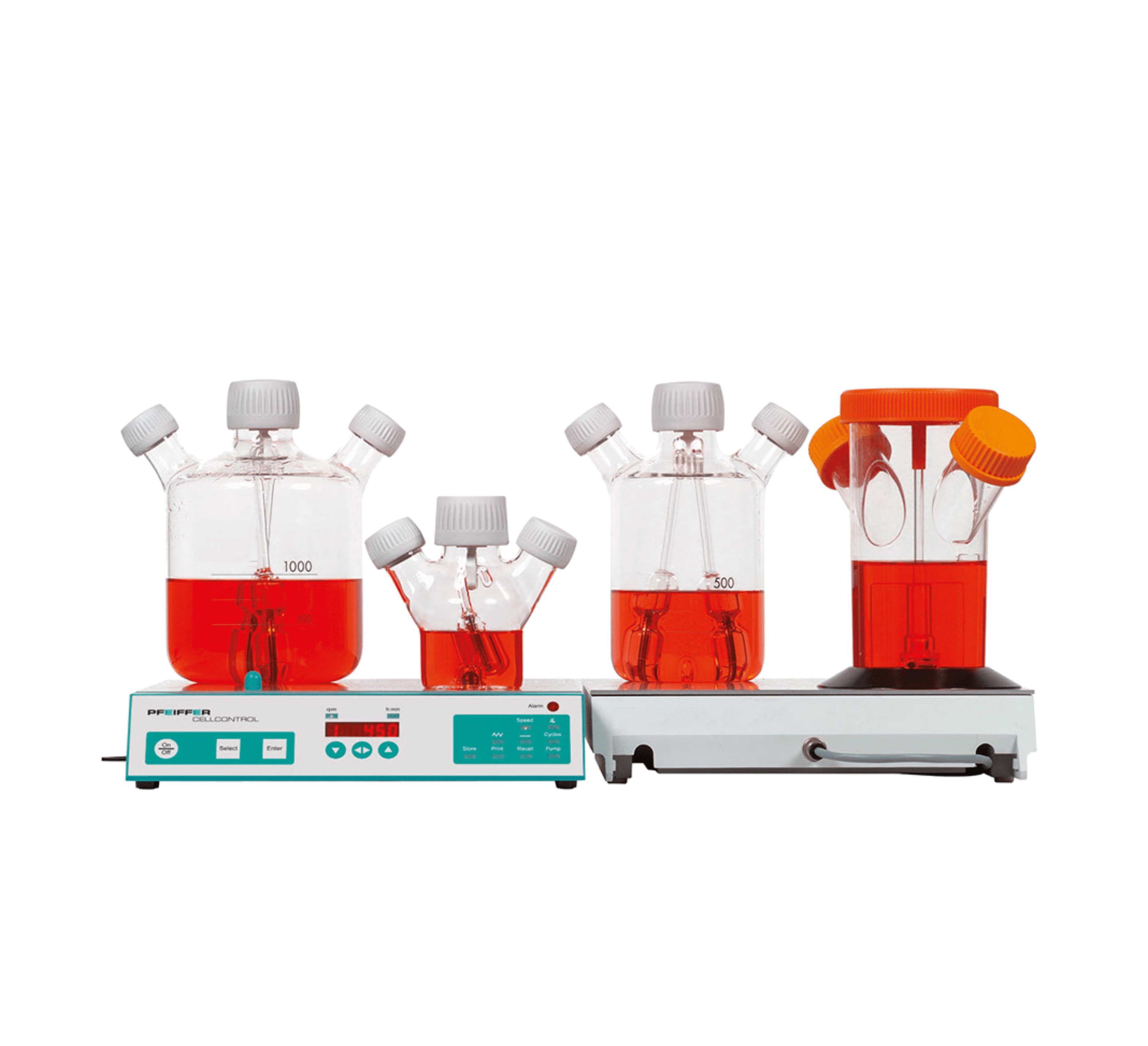 The CELLSPIN is a stirrer for cultivating cells in spinner bottles with culture volumes from 100 to 1000 ml. The speed (5–75 rpm) and other stirring parameters can be individually programmed and modified at any time via the control unit, which is located outside of the incubator.