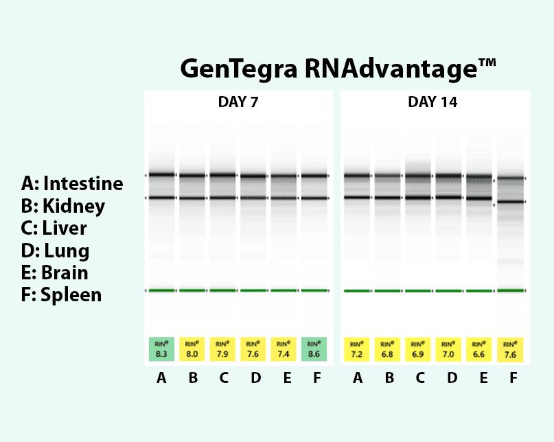 The major advantage of RNAdvantage is the ability to perform high-quality downstream studies. This is due to the excellent preservation made possible by GenTegra RNAdvantage, with its excellent RIN scores of 7 or more.