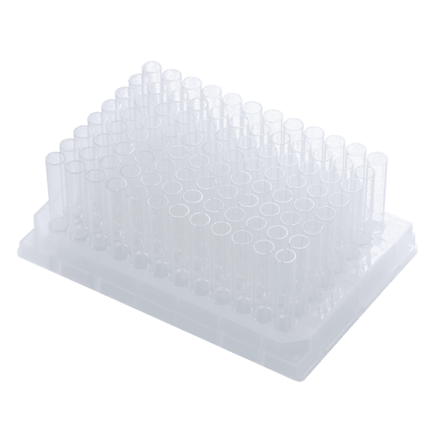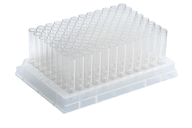 96-well glass tube plate for pure, mid-volume sample handling. Ideal for assays and solvent use.