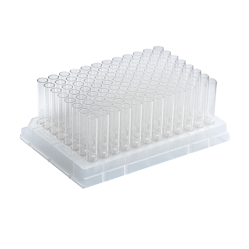 The plate is fully made from polypropylene (PP), lightweight, chemically resistant, and widely used in life sciences. It has room for a total of 96 inserts, which can be purchased prefilled & fixed, tubes in bulk or the plates without the tubes. The plates with prefilled glass tubes have the tubes fixed to the itself. All the plates are supplied with a clear, protective lid, so the glass tubes won’t fall out during transport or storage.